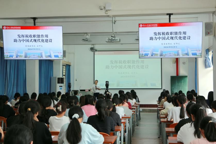 安仲文副書記在中堯校區(qū)講述了題為“發(fā)揮稅收職能作用 助力中國式現(xiàn)代化建設(shè)”的課程,他從什么是中國式現(xiàn)代化、實(shí)現(xiàn)中國式現(xiàn)代化錢從哪里來、依法誠信納稅共建和諧社會三個方面進(jìn)行講授。他以我國稅收制度為切入點(diǎn)解讀了深化財(cái)稅體制改革,指出稅收法治建設(shè)是法治國家、法治政府、法治社會建設(shè)的重要內(nèi)容,是實(shí)現(xiàn)國家治理體系和治理能力現(xiàn)代化的必然要求。他強(qiáng)調(diào)作為新時代青年,要以學(xué)習(xí)好貫徹好黨的二十屆三中全會精神為契機(jī),要切實(shí)提高政治站位,深刻領(lǐng)會、準(zhǔn)確把握黨的二十屆三中全會的重大意義、豐富內(nèi)涵、核心要義和實(shí)踐要求,切實(shí)把思想和行動統(tǒng)一到全會精神上來,踏實(shí)學(xué)習(xí),努力奮斗,為奮力譜寫中國式現(xiàn)代化廣西篇章添磚加瓦。