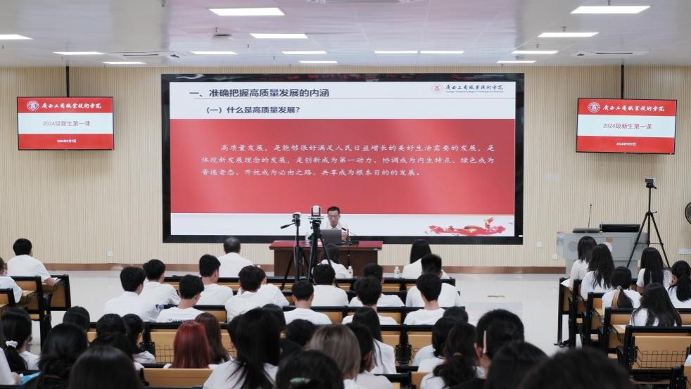 劉進(jìn)校長在武鳴校區(qū)講述了題為“牢牢把握高質(zhì)量發(fā)展這個首要任務(wù)”的課程,主要圍繞準(zhǔn)確把握高質(zhì)量發(fā)展的內(nèi)涵、推動高質(zhì)量發(fā)展取得的偉大成就、青年如何為中國式現(xiàn)代化廣西篇章挺膺擔(dān)當(dāng)三個方面展開。劉進(jìn)校長為新生詳細(xì)解讀了高質(zhì)量發(fā)展的內(nèi)涵,回顧了黨的十八大以來我國推動高質(zhì)量發(fā)展取得的成就和廣西推動高質(zhì)量發(fā)展取得的成就。他表示,黨的十八大以來,以習(xí)近平同志為核心的黨中央團(tuán)結(jié)帶領(lǐng)全黨全國人民立足新發(fā)展階段,貫徹新發(fā)展理念,構(gòu)建新發(fā)展格局,推動高質(zhì)量發(fā)展取得歷史性偉大成就。他以廣西首位“大國工匠”鄭志明和廣西五一勞動獎?wù)芦@得者、我校校友肖蓮花的事例勉勵青年學(xué)生勇?lián)鷷r代使命,主動投身經(jīng)濟(jì)發(fā)展主戰(zhàn)場、科研攻關(guān)最前沿、鄉(xiāng)村振興第一線,保持“拼”的精神、“闖”的勁頭、“創(chuàng)”的勇氣,開拓創(chuàng)新、銳意進(jìn)取、苦干實(shí)干,為建設(shè)新時代壯美廣西貢獻(xiàn)青春力量。