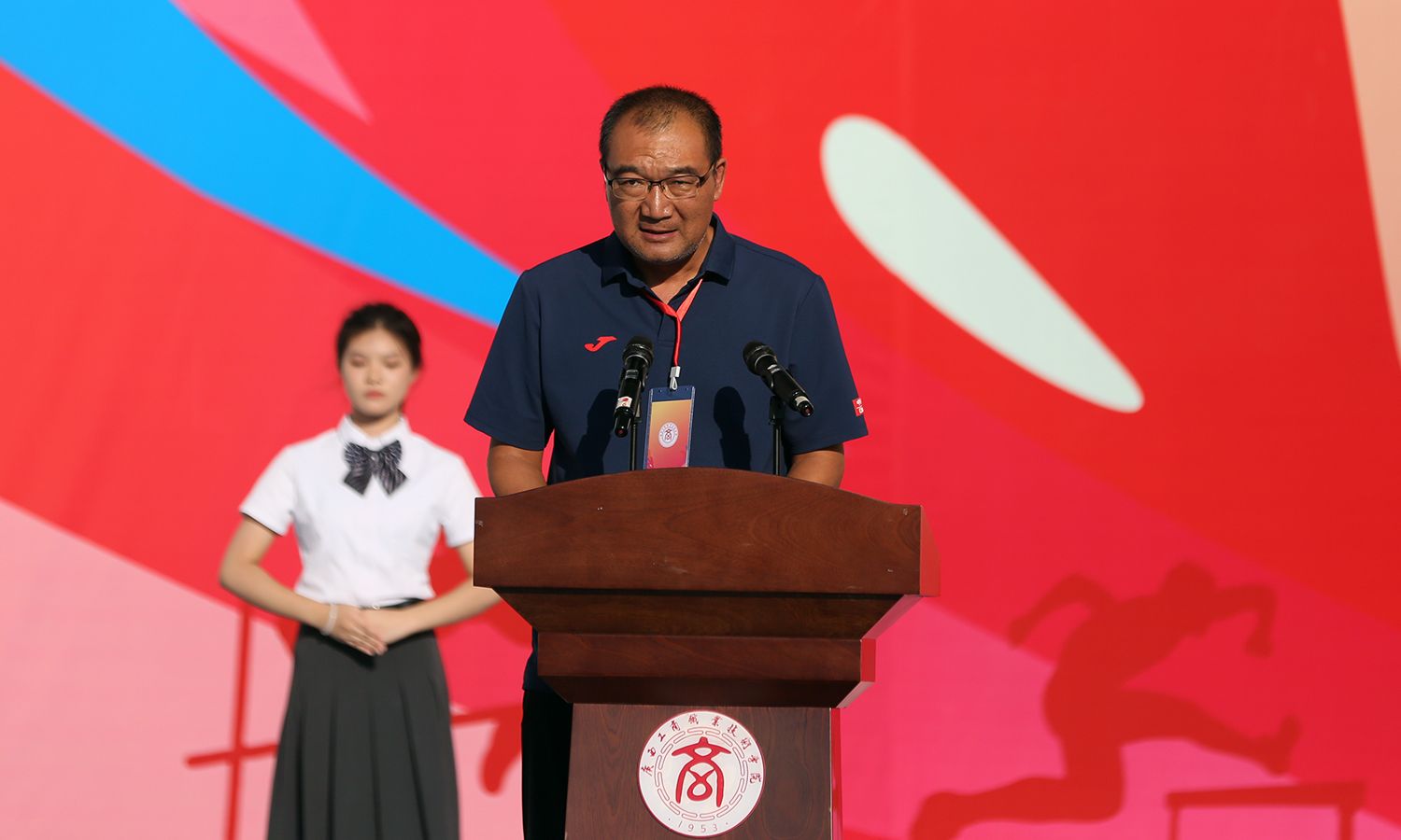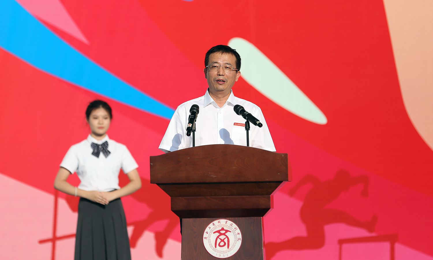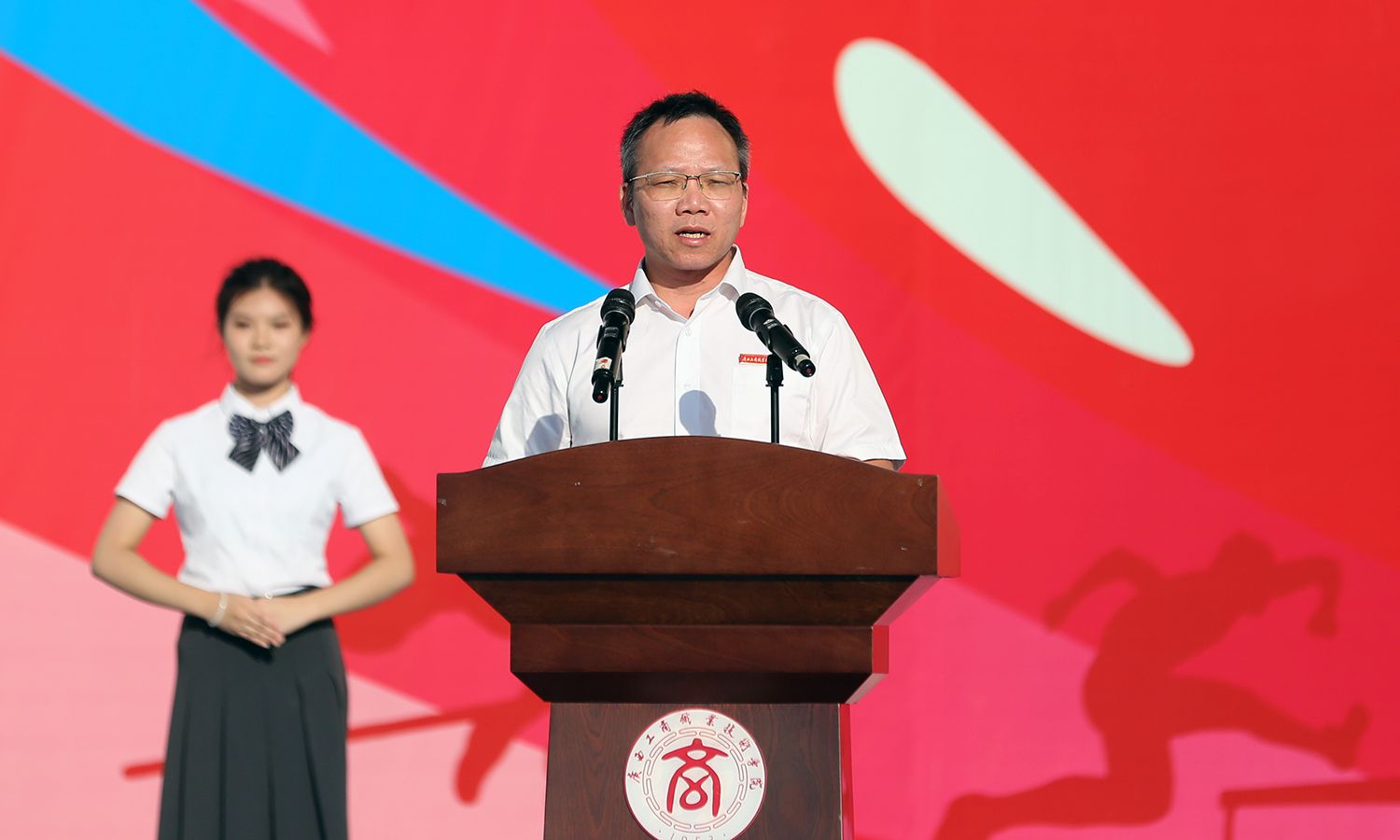 隨后,劉進(jìn)校長為閉幕式致辭,他向取得優(yōu)異成績的運(yùn)動(dòng)員表示祝賀,對辛勤付出的全體工作人員表示衷心感謝。他表示,本次運(yùn)動(dòng)會(huì)精彩紛呈,運(yùn)動(dòng)員們在賽場上你追我趕、奮勇爭先,彰顯了拼搏進(jìn)取、團(tuán)結(jié)友愛的精神,讓我們感受到了運(yùn)動(dòng)的魅力與青春的力量,這是一場青春閃耀的盛會(huì),不僅賽出了風(fēng)格,更賽出了友誼和高水平。劉進(jìn)校長強(qiáng)調(diào),體育運(yùn)動(dòng)不僅是鍛煉身體的方式,更是培養(yǎng)意志品質(zhì)、增強(qiáng)團(tuán)結(jié)合作的重要途徑,希望同學(xué)們將運(yùn)動(dòng)會(huì)中展現(xiàn)的拼搏精神和團(tuán)結(jié)意識延續(xù)到今后的學(xué)習(xí)和生活中。他勉勵(lì)廣大師生要堅(jiān)定信念,求真務(wù)實(shí),繼續(xù)秉持對體育的熱愛,積極鍛煉身體,增強(qiáng)體魄,為校園注入更多活力與光彩;要努力工作,勤奮學(xué)習(xí),積極為學(xué)校新一輪“雙高”建設(shè)貢獻(xiàn)自身的智慧與力量,共同譜寫學(xué)校輝煌的新篇章。