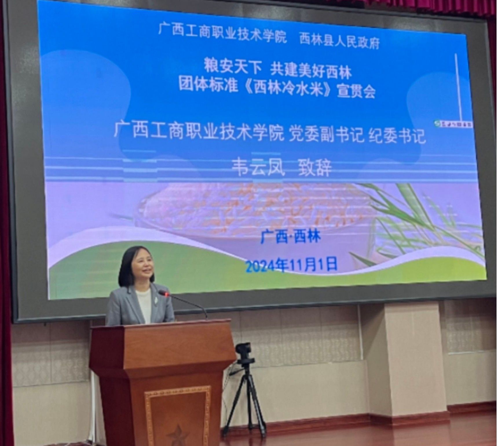 為了進(jìn)一步做好《西林冷水米》團(tuán)體標(biāo)準(zhǔn)的宣傳推廣事宜,全面推動(dòng)糧食安全及節(jié)糧減損宣傳工作, 11月1日,學(xué)校黨委副書記、紀(jì)委書記、《西林冷水米》團(tuán)體標(biāo)準(zhǔn)項(xiàng)目負(fù)責(zé)人、鄉(xiāng)村科技特派員韋云鳳帶領(lǐng)糧油康旅學(xué)院副院長(zhǎng)裴朝東、專家工作負(fù)責(zé)人李影球博士等一行3人,來(lái)到西林縣開展團(tuán)體標(biāo)準(zhǔn)《西林冷水米》宣傳推廣活動(dòng),并開展科技特派員系列培訓(xùn)及技術(shù)服務(wù)工作。