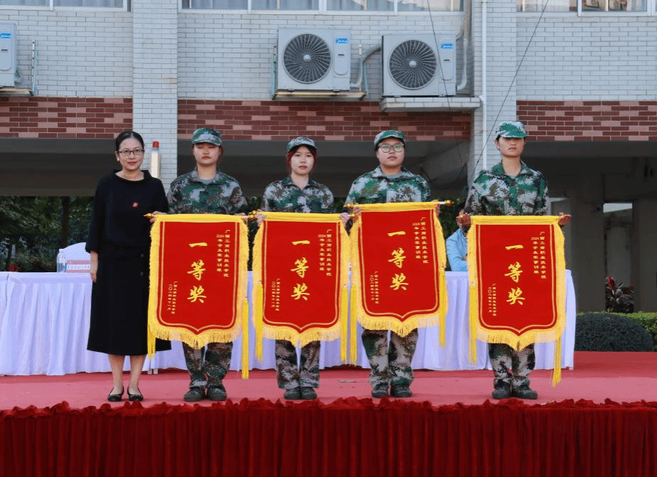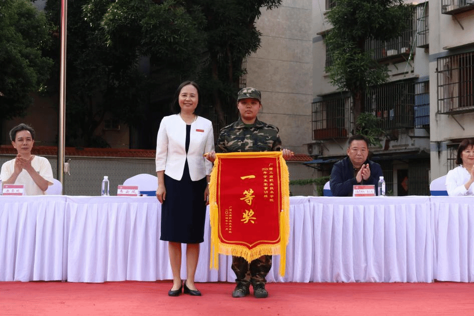 軍訓匯演結(jié)束后,良慶區(qū)人民武裝部領(lǐng)導宣布會操結(jié)果。學校領(lǐng)導、良慶區(qū)人民武裝部領(lǐng)導、各二級學院有關(guān)負責人為獲獎班級頒發(fā)錦旗。