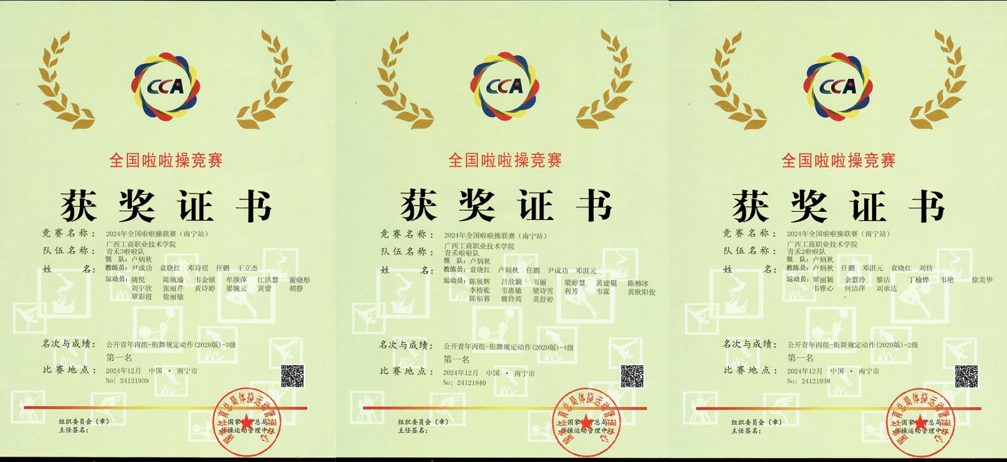 2024年12月6日-8日,由國(guó)家體育總局體操管理中心、中國(guó)蹦床與技巧協(xié)會(huì)主辦,廣西社會(huì)體育運(yùn)動(dòng)中心、廣西學(xué)校體育衛(wèi)生藝術(shù)學(xué)會(huì)承辦的2024年全國(guó)啦啦操聯(lián)賽(南寧站)在廣西建設(shè)職業(yè)技術(shù)學(xué)院舉行,來自廣西區(qū)內(nèi)外386支參賽隊(duì)同臺(tái)競(jìng)技。我校盧炳秋、尹成功、袁曉紅、劉倩、任鵬、鄧淇元等6位教師指導(dǎo)的三支參賽隊(duì)伍獲得公開青年丁組集體街舞規(guī)定動(dòng)作2級(jí)、3級(jí)、4級(jí)三個(gè)賽項(xiàng)第一名的優(yōu)異成績(jī)。