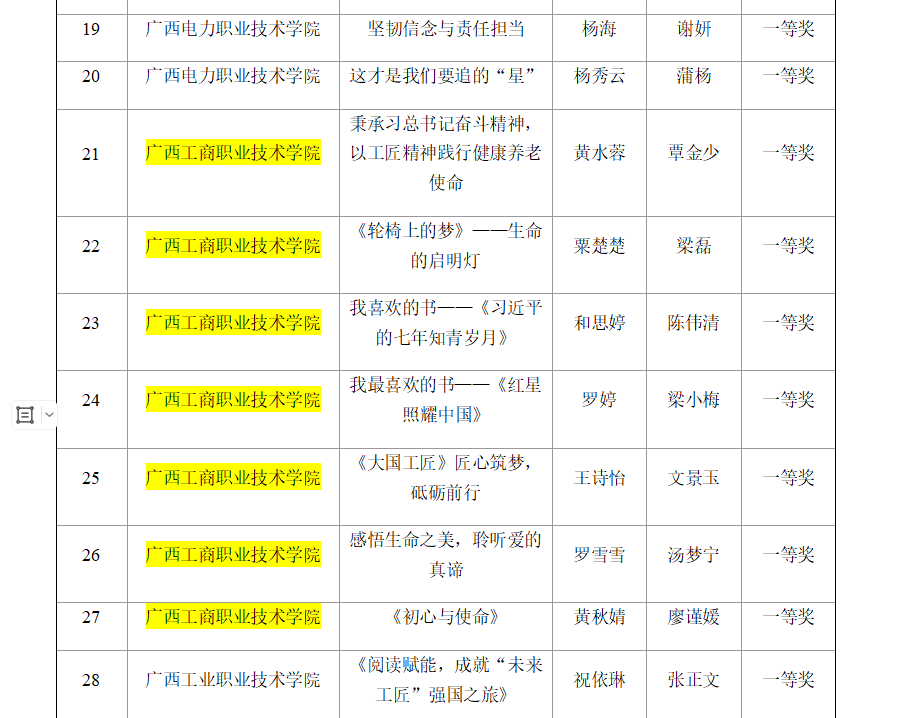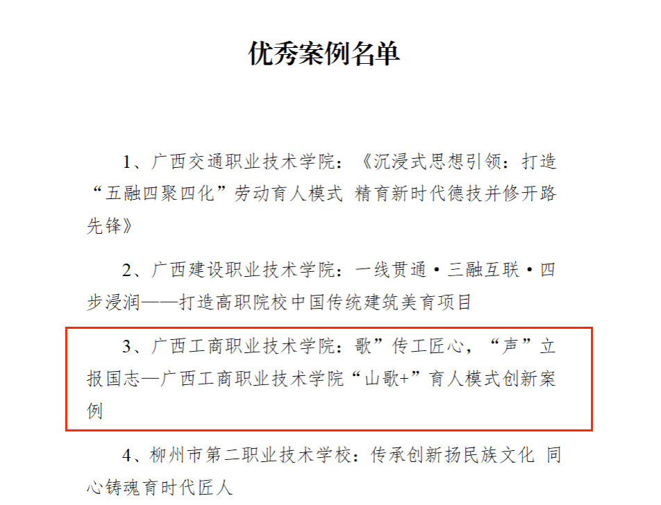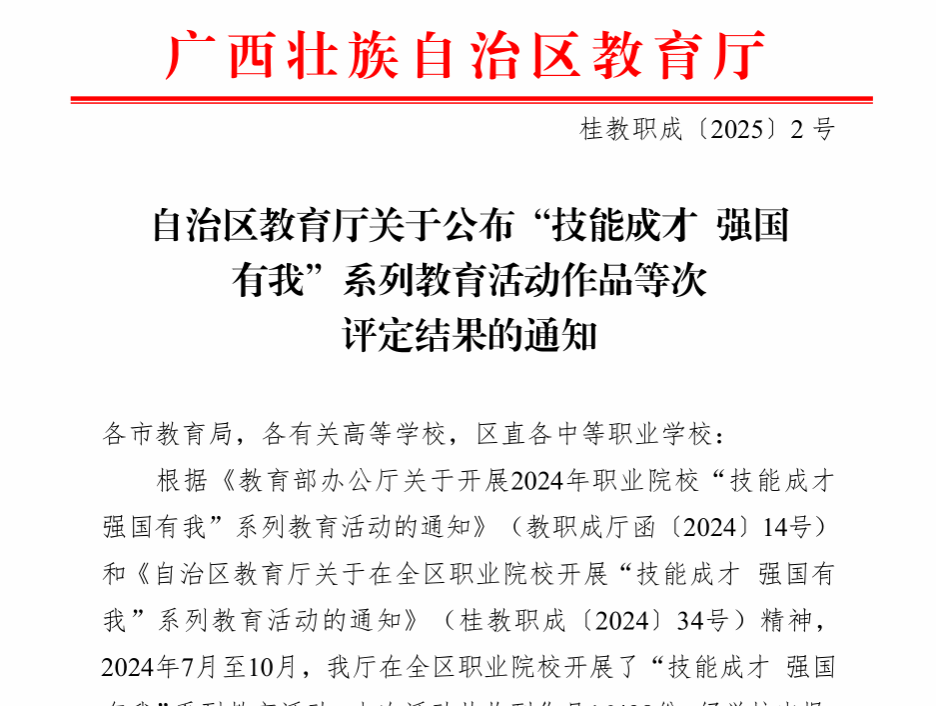 近日,自治區(qū)教育廳公布了2024年全區(qū)“技能成才 強國有我”系列教育活動作品等次評定結(jié)果,我校在此次活動中表現(xiàn)優(yōu)異,共推薦319項作品和2個典型案例入圍區(qū)賽。經(jīng)過激烈角逐,我校斬獲佳績:34項作品榮獲一等獎,68項作品榮獲二等獎,105項作品榮獲三等獎,《“歌”傳工匠心,“聲”立報國志——廣西工商職業(yè)技術(shù)學院“山歌+”育人模式創(chuàng)新案例》榮獲優(yōu)秀典型案例。此外,學校還榮獲優(yōu)秀組織獎,充分展現(xiàn)了我校在技能教育和人才培養(yǎng)方面的成果。