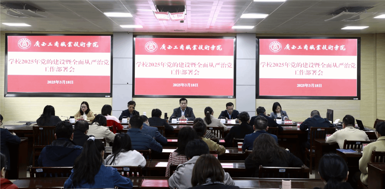 3月18日,學(xué)校在鵬飛校區(qū)召開2025年黨的建設(shè)暨全面從嚴治黨工作部署會,學(xué)習(xí)全區(qū)高校黨的建設(shè)工作會議精神,部署學(xué)校2025年黨的建設(shè)暨全面從嚴治黨工作和學(xué)校2025年紀(jì)檢監(jiān)察工作。學(xué)校黨委書記李維,學(xué)校校長劉進,學(xué)校黨委副書記安仲文,學(xué)校黨委副書記、紀(jì)委書記韋云鳳,學(xué)校副校長鄭華參加會議。