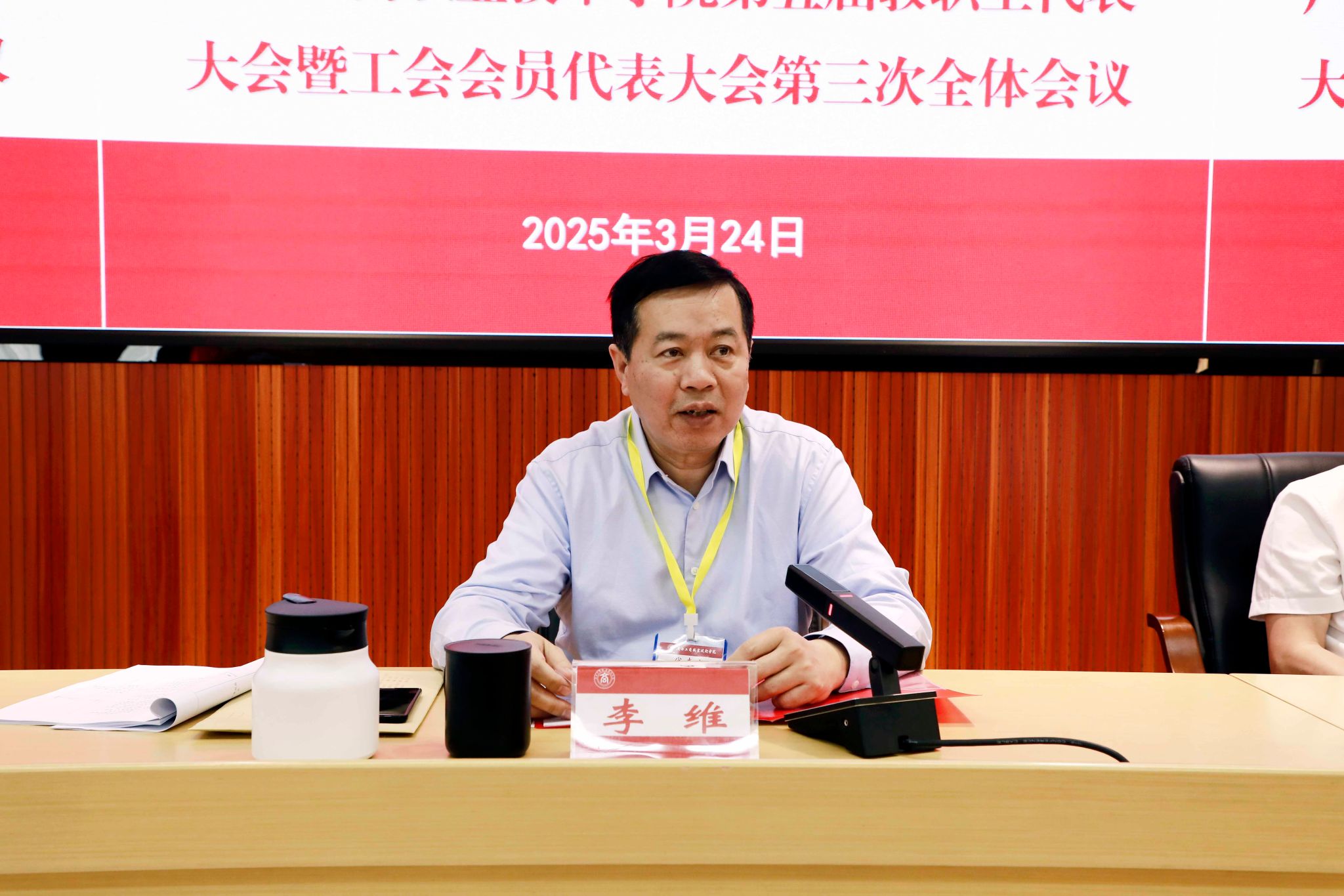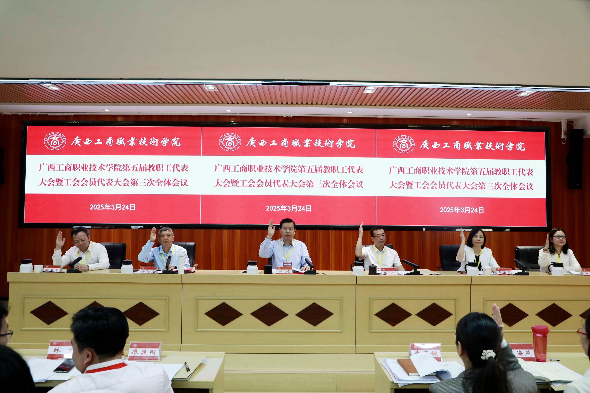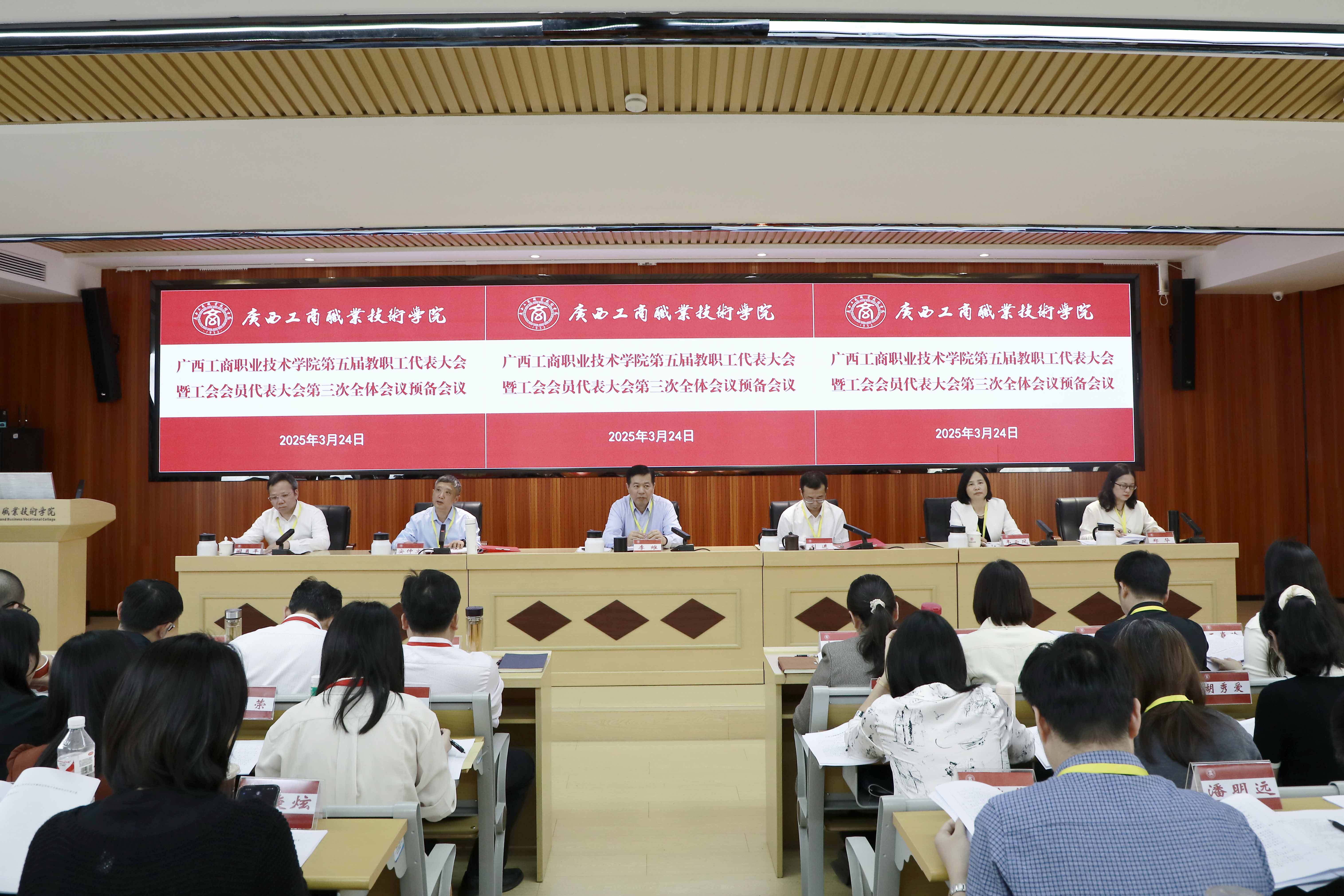 凝心聚力謀發(fā)展,砥礪奮進(jìn)譜新篇。3月24日,學(xué)校在鵬飛校區(qū)召開第五屆教職工代表大會暨工會會員代表大會第三次全體會議。學(xué)校黨委書記李維,黨委副書記、校長劉進(jìn),黨委副書記安仲文,黨委副書記、紀(jì)委書記韋云鳳,副校長闕勇平,副校長鄭華,來自全校各部門各單位的教代會代表、工代會代表、列席代表、特邀代表參加會議。