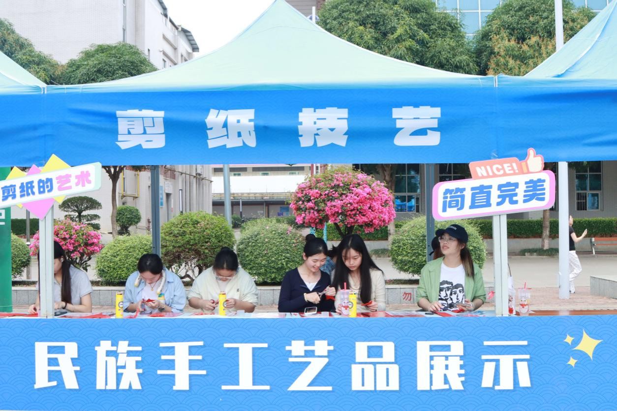 此外,開(kāi)幕式還舉辦了民族文化體驗(yàn)活動(dòng),師生齊聚各校區(qū)田徑場(chǎng),參加這一場(chǎng)民族文化盛宴,積極參與到豐富多彩的民族文化體驗(yàn)活動(dòng)當(dāng)中。民族體育競(jìng)技、民族美食品嘗、手工藝品展示等環(huán)節(jié)吸引了眾多師生駐足。大家親手體驗(yàn)了蠶絲繞扇工藝、藍(lán)染、手工繡球制作、博白芒編等傳統(tǒng)技藝,欣賞了琳瑯滿目的民族手工藝品和學(xué)生創(chuàng)意作品。壯鄉(xiāng)特色美食更是讓師生們贊不絕口,現(xiàn)場(chǎng)氣氛熱烈。
