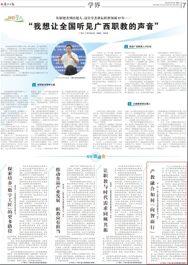 2025年5月13日,《廣西日報》學界版刊發(fā)學校黨委副書記、校長劉進署名文章,標題為《產(chǎn)教融合如何“向智而行”》,全文如下: