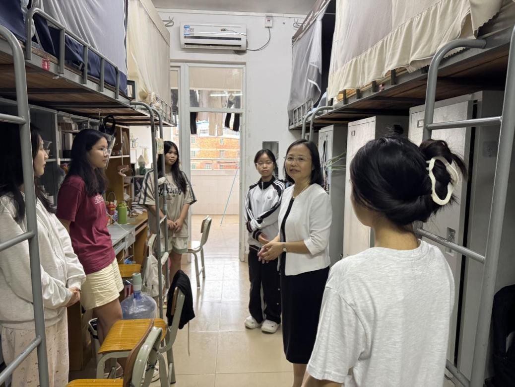 走訪過程中,韋云鳳深切關懷學生住宿安全及學習環(huán)境。她細致檢查宿舍用電安全、消防通道與衛(wèi)生狀況,強調(diào)“宿舍是大家共同的家園,安全整潔至關重要”,叮囑學生嚴守管理規(guī)定,嚴禁使用違規(guī)電器,確保居住環(huán)境安全舒適。同時,韋云鳳特別關注學生學業(yè)進展與學習氛圍營造,與同學們交流學習規(guī)劃與困難,勉勵大家科學制定學業(yè)目標,精進專業(yè)知識,善用圖書館等資源提升綜合素養(yǎng)。她提出宿舍應成為互助共進的“學習型空間”,鼓勵營造積極向上的學風,并囑咐學生注重勞逸結(jié)合,保持身心健康。