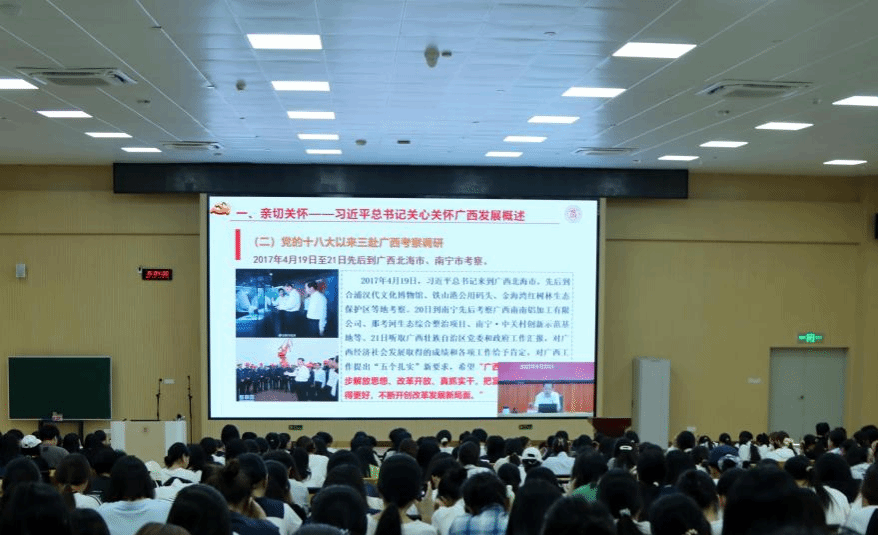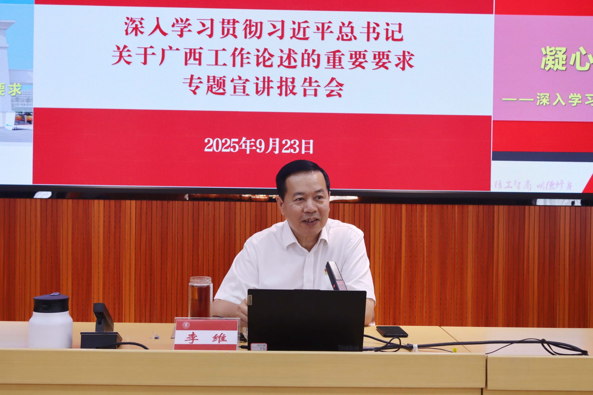 李維書記在宣講報(bào)告中指出,習(xí)近平總書記對廣西工作高度重視,多次親臨廣西考察調(diào)研,多次就廣西工作發(fā)表重要講話、作出重要指示批示,深刻闡明了事關(guān)廣西發(fā)展全局的根本性、方向性、戰(zhàn)略性問題,為建設(shè)新時(shí)代壯美廣西樹立了新的歷史坐標(biāo)、提供了新的戰(zhàn)略指引。他強(qiáng)調(diào),學(xué)校經(jīng)過70多年的接續(xù)奮斗,各項(xiàng)建設(shè)走上高質(zhì)量發(fā)展的快車道。學(xué)校黨委將進(jìn)一步全面深化改革、開拓創(chuàng)新、砥礪奮進(jìn),牢固樹立“實(shí)干為要、創(chuàng)新為魂,用業(yè)績說話、讓人民評價(jià)”的鮮明導(dǎo)向,圍繞落實(shí)立德樹人根本任務(wù),堅(jiān)持提質(zhì)量、強(qiáng)效能、穩(wěn)保障、惠民生,提高辦學(xué)水平、增強(qiáng)綜合實(shí)力、實(shí)現(xiàn)學(xué)校高質(zhì)量發(fā)展。他勉勵(lì)學(xué)校學(xué)子,要牢記習(xí)近平總書記殷切囑托,堅(jiān)定不移聽黨話、跟黨走,爭做有理想、敢擔(dān)當(dāng)、能吃苦、肯奮斗的新時(shí)代好青年,在推進(jìn)強(qiáng)國建設(shè)、民族復(fù)興偉業(yè)中展現(xiàn)作為、彰顯風(fēng)采、貢獻(xiàn)力量,奮力書寫中國式現(xiàn)代化廣西篇章的青春答卷。