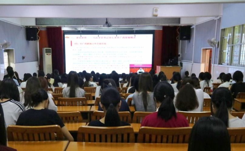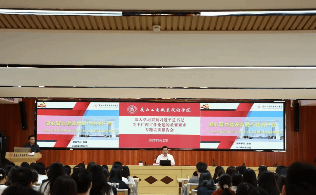 為深入學(xué)習(xí)貫徹習(xí)近平總書記關(guān)于廣西工作論述的重要要求,鑄牢中華民族共同體意識,推動(dòng)黨的創(chuàng)新理論有效觸達(dá)青年群體,根據(jù)自治區(qū)黨委宣傳部《理論宣講青年群體全覆蓋三年行動(dòng)計(jì)劃工作方案》安排,9月23日,學(xué)校在鵬飛校區(qū)舉辦深入學(xué)習(xí)貫徹習(xí)近平總書記關(guān)于廣西工作論述的重要要求專題宣講報(bào)告會(huì),學(xué)校黨委書記李維作題為《凝心聚力建設(shè)新時(shí)代壯美廣西——深入學(xué)習(xí)貫徹習(xí)近平總書記關(guān)于廣西工作論述的重要要求》的專題宣講報(bào)告。宣講報(bào)告會(huì)采取線下講授、線上直播結(jié)合的形式展開,全體在校生聽取報(bào)告會(huì)。
