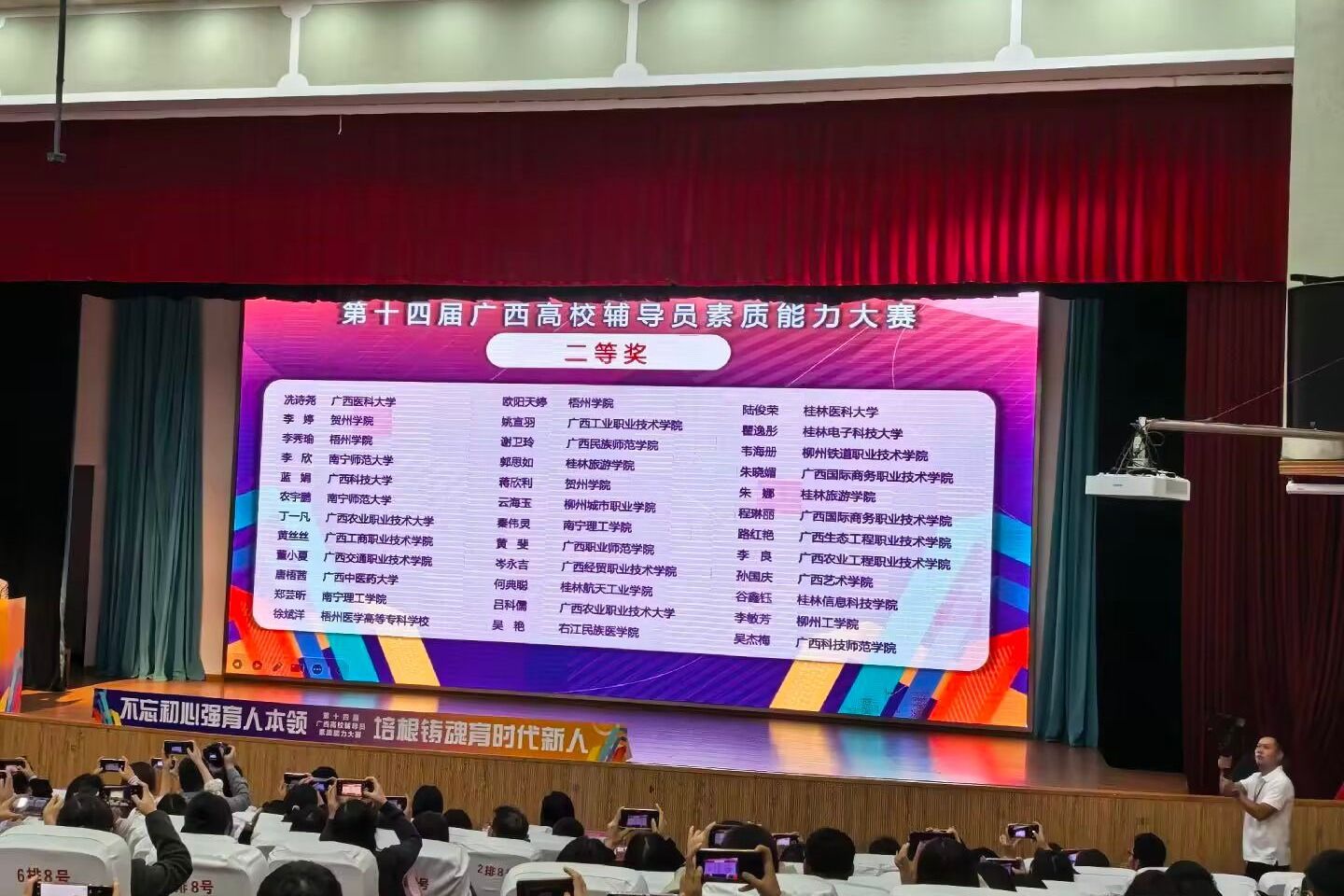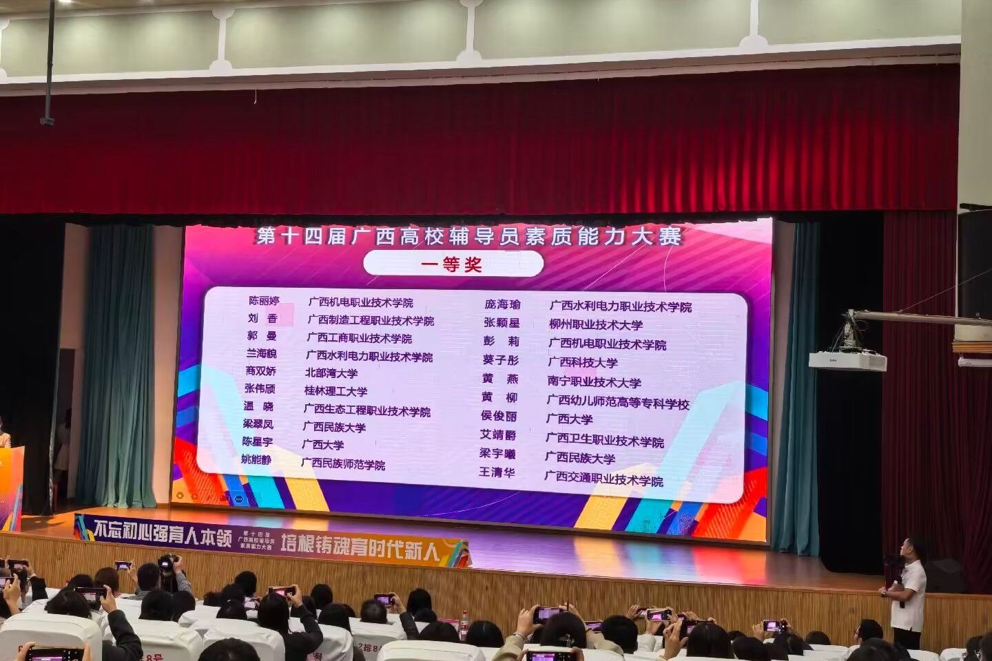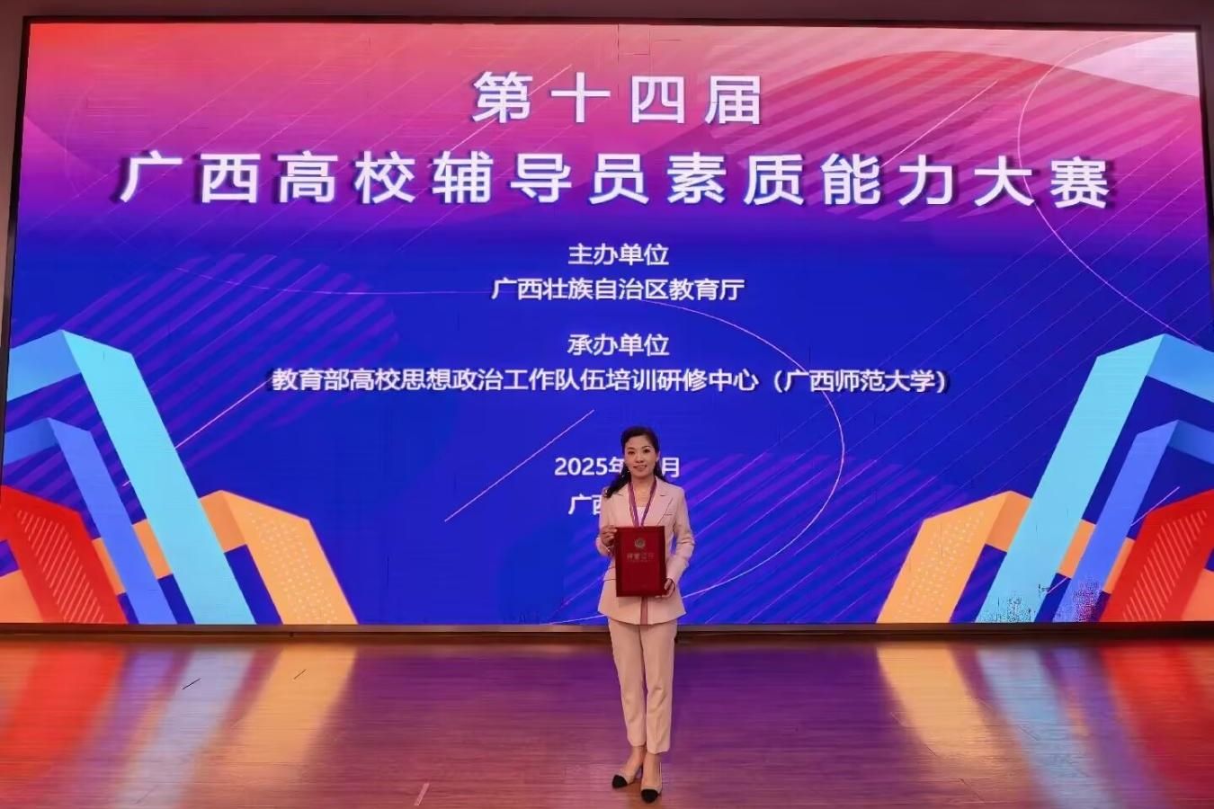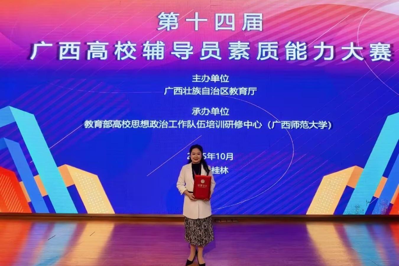 2025年10月29日至31日,由廣西壯族自治區(qū)教育廳主辦、教育部高校思想政治工作隊伍培訓(xùn)研修中心(廣西師范大學(xué))承辦的第十四屆廣西高校輔導(dǎo)員素質(zhì)能力大賽(簡稱“大賽”)在廣西桂林圓滿落下帷幕,來自全區(qū)高校的113名參賽選手同臺競技。經(jīng)過激烈角逐,我校參賽選手——經(jīng)貿(mào)與康旅學(xué)院郭曼老師榮獲一等獎、會計學(xué)院黃絲絲老師榮獲二等獎。