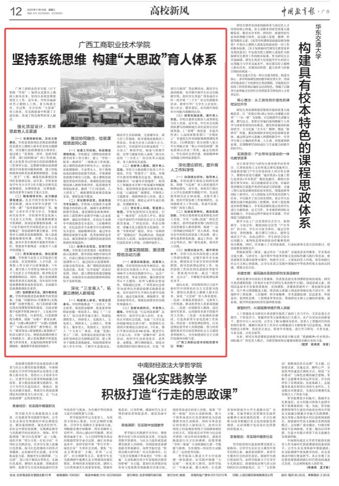 2025年11月19日,《中國教育報》刊登學(xué)校黨委書記李維署名文章,標(biāo)題為:《廣西工商職業(yè)技術(shù)學(xué)院堅持系統(tǒng)思維 構(gòu)建“大思政”育人體系》,全文如下: