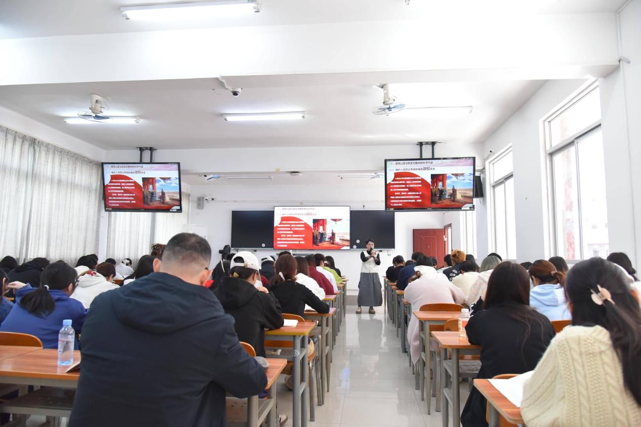 在專題授課環(huán)節(jié),陳寧春以《深入學(xué)習(xí)黨的二十屆四中全會精神 勇?lián)笆逦濉睍r代使命》為題,結(jié)合中國發(fā)展鮮活實踐與學(xué)生身邊可感可知的現(xiàn)實案例,從四大維度展開講解:一是“十四五”時期我國在經(jīng)濟、科技、民生等領(lǐng)域取得的標(biāo)志性重大成就;二是“十五五”時期錨定高質(zhì)量發(fā)展、推進中國式現(xiàn)代化的重大戰(zhàn)略意義;三是黨的二十屆四中全會為國家未來發(fā)展擘畫的宏偉藍圖與實踐路徑;四是回顧學(xué)校高職辦學(xué)以來在“十四五”期間實現(xiàn)的跨越式發(fā)展與突破。陳寧春深入淺出解讀了政策內(nèi)涵,引導(dǎo)學(xué)生將個人成長與國家發(fā)展、時代需求緊密結(jié)合,深刻領(lǐng)會全會精神,樹立勇?lián)笆逦濉笔姑呢?zé)任意識。