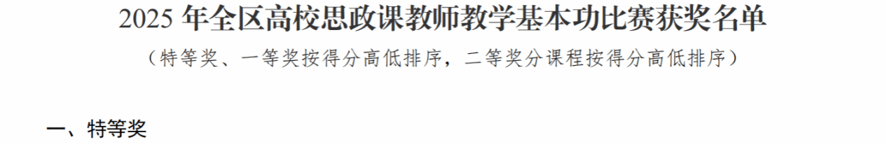 據(jù)悉,2025年全區(qū)高校思政課教師教學基本功比賽自今年8月份啟動以來,全區(qū)各高校共推薦249名教師參賽。經(jīng)初賽、決賽,高職高專組3名教師獲得特等獎,10名教師獲得一等獎,36名教師獲得二等獎。