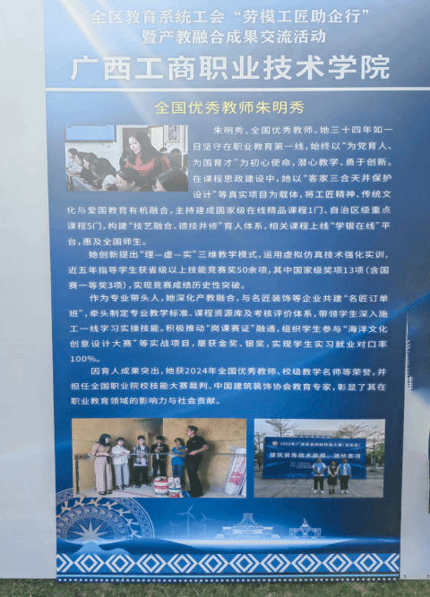 12月18日,由自治區(qū)教育工會主辦的全區(qū)教育系統(tǒng)工會“勞模工匠助企行”暨產(chǎn)教融合成果交流活動在廣西機電職業(yè)技術(shù)學院舉行。本次活動旨在推廣勞模精神、工匠精神,深化產(chǎn)教融合、校企合作,促進職業(yè)教育與產(chǎn)業(yè)需求緊密對接。我校全國優(yōu)秀教師、無黨派人士朱明秀教授教學成果入選全區(qū)教育系統(tǒng)工會“勞模工匠助企行”暨產(chǎn)教融合成果交流展。