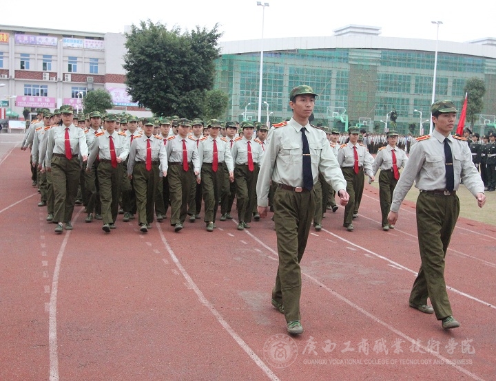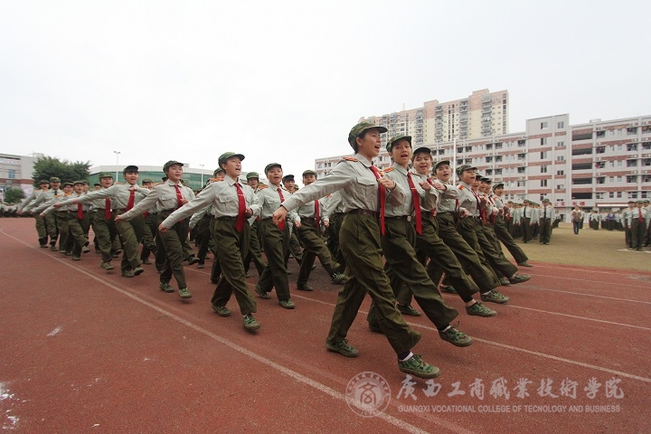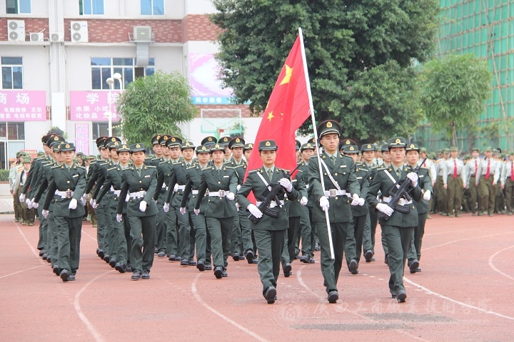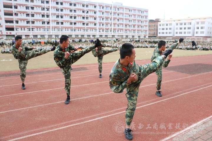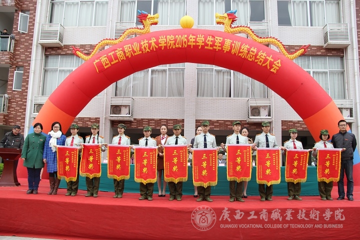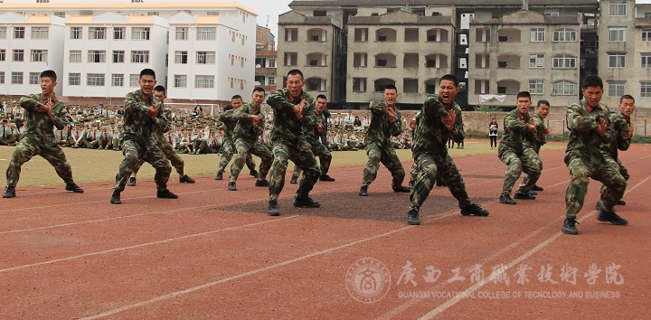 列隊(duì)檢閱完畢,武警廣西總隊(duì)直屬支隊(duì)曾又群副大隊(duì)長宣布軍訓(xùn)評(píng)選名單。學(xué)院黨委書記覃武云,武警廣西總隊(duì)直屬支隊(duì)政治處副主任楊和奎以及各系部主任分別為軍訓(xùn)獲獎(jiǎng)班級(jí)頒發(fā)錦旗。緊接著教官向全體師生展示了列隊(duì)、擒拿格斗中的倒功和軍體拳等表演。動(dòng)作整齊,雄姿英發(fā),軍體拳聲聲有力,摔擒表演更是博得滿場喝彩。