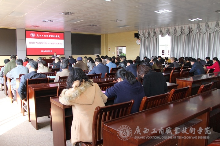 2016年2月29日下午15:00,我院在校本部2119視頻會議室舉行領(lǐng)導(dǎo)班子和領(lǐng)導(dǎo)干部2015年度考核測評會。自治區(qū)黨委干部處副處長鄧紅專、自治區(qū)高校工委組織部主任科員羅建嵐、學(xué)院覃武云書記、學(xué)院陳杰院長、學(xué)院蒙啟成副書記、學(xué)院李仕欽副院長、學(xué)院李維副院長、學(xué)院副廳級調(diào)研員黃永蓬出席了本次會議,學(xué)院中層管理干部及正高職稱教師參加了此次大會。會議由覃武云書記主持。