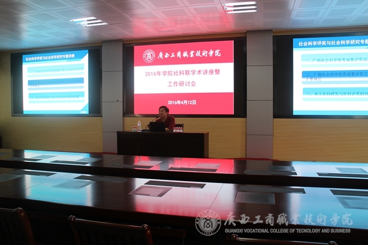 為進一步加強師資隊伍建設(shè),規(guī)范我校社會科學(xué)研究及評獎申報工作程序,加強我校哲學(xué)社會科學(xué)項目暨廣西第十四次社會科學(xué)優(yōu)秀成果獎申報組織工作,全面提高我校教師的教學(xué)、科研學(xué)術(shù)能力以及科研成果轉(zhuǎn)化工作水平,2016年4月12日下午15:00,我院在校本部2119會議室舉辦了“社科聯(lián)學(xué)術(shù)講座暨工作研討會”,學(xué)院社科聯(lián)特別邀請了自治區(qū)社科聯(lián)黨組成員、副主席曹平研究員為我院教師作了題為《社會科學(xué)評獎與社會科學(xué)研究》的專題講座。講座由我院社科聯(lián)主席、學(xué)院黨委副書記兼紀(jì)委書記蒙啟成主持,會計系、經(jīng)管系、財信系、社科部、公共部、學(xué)工部等六個教學(xué)系部及相關(guān)行政部門的近100名教師聆聽了講座。