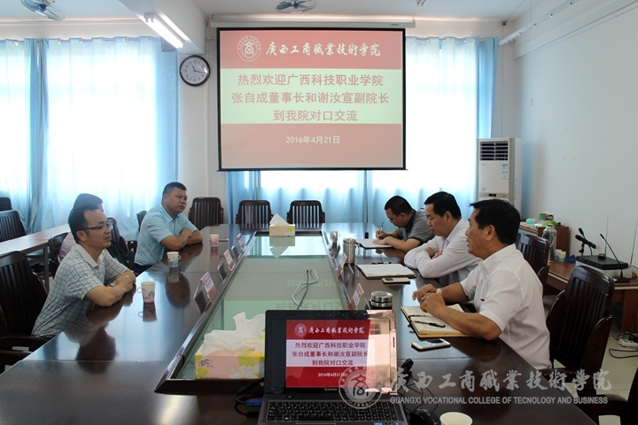 2016年4月21日上午,廣西科技職業(yè)技術(shù)學(xué)院張自成董事長(zhǎng)、謝汝宣副院長(zhǎng)和吳先夏副院長(zhǎng)一行到我院進(jìn)行對(duì)口交流。我校李維副院長(zhǎng)、教務(wù)科研處處長(zhǎng)韋勝強(qiáng)和教務(wù)處相關(guān)同志參與會(huì)議。