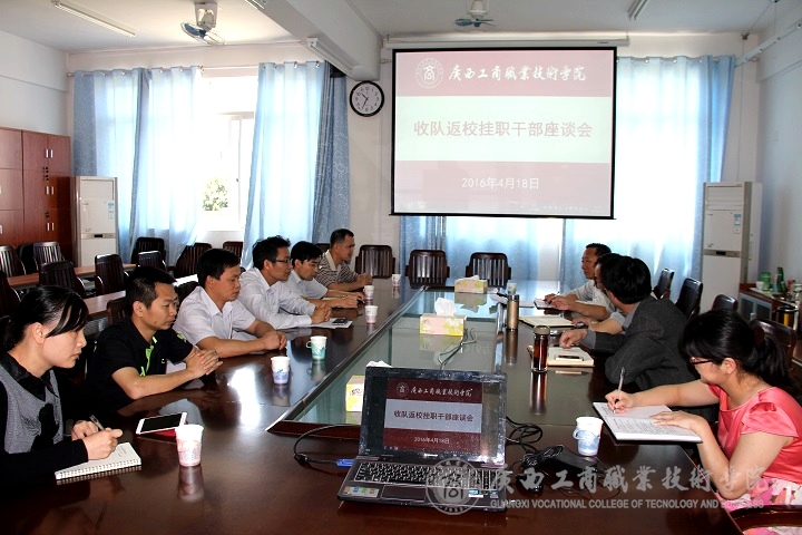 2016年4月,我院派駐鹿寨縣、北流市貧困村黨組織第一書記、“美麗廣西”工作隊(duì)員一批3人任職期滿,收隊(duì)返校。2016年4月18日上午,學(xué)院黨委在校本部教學(xué)樓2019會議室召開收隊(duì)返校掛職干部座談會,學(xué)院黨委副書記、紀(jì)委書記蒙啟成,學(xué)院黨委組織部領(lǐng)導(dǎo)、后勤管理處有關(guān)領(lǐng)導(dǎo)及掛職干部楊名、陳清林、黃晨華等同志參加了會議。