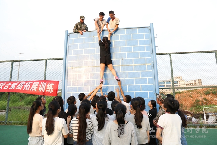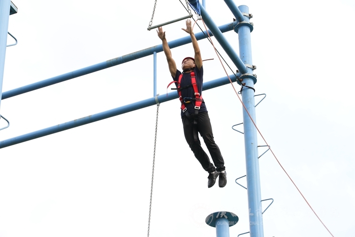 在訓練當天,分別進行了“孤島求生”、“高空抓桿”和“災難墻”三個項目的訓練。在進行“孤獨求生”項目的時候,全員參與,每組隊員分別被分散在“珍珠島”、“盲人島”和“啞人島”三個島上,本次項目的任務是要把所有都要集中到“珍珠島”上,而這就需要隊員們發(fā)揮自己的觀察能力、溝通能力、創(chuàng)新能力;在進行“高空抓桿”項目的時候,采取的是自愿原則,兩組競技,看哪支隊伍挑戰(zhàn)的人數(shù)多。面對4米高的挑戰(zhàn)臺,兩隊隊員依舊無所畏懼,踴躍的報名參加挑戰(zhàn),挑戰(zhàn)屬于自己的新高度,挑戰(zhàn)的隊員都戰(zhàn)勝了自己、戰(zhàn)勝了恐懼、躍出了新高度,抓住了“人生巔峰之桿”;在進行“災難墻”項目的時候,30名隊員要在沒有任何幫助和輔助工具下,翻過4米高的墻。面對4米高的墻,隊員們沒有退縮,而是齊心協(xié)力搭起了一把“人梯”,把隊員們運送到高墻之上。在隊員的們團結協(xié)作下,任務完成。