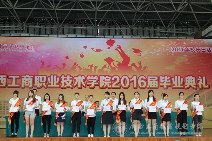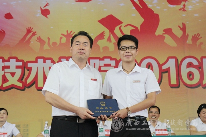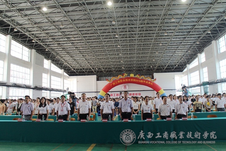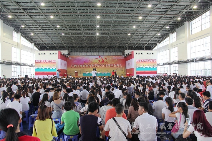 ??????? 又是紫荊花開時,又是一年畢業(yè)季,“學(xué)海浩瀚,憑誰鵬飛起航。光華歲月,任我青春飛揚?!庇茡P激蕩的《廣商院之歌》不時在鵬飛路上空回蕩,燦爛的陽光輝映著廣商院美麗的校園,文體館內(nèi)陣陣清風(fēng)撲面而來。2016年6月26日下午,廣西工商職業(yè)技術(shù)學(xué)院2016屆畢業(yè)典禮在校本部文體館二樓隆重舉行。學(xué)院黨委書記覃武云、院長陳杰等校領(lǐng)導(dǎo)、學(xué)院各部門主要負責(zé)人出席,2016屆2200多位畢業(yè)生及班主任參加。畢業(yè)典禮由蒙啟成副書記主持。