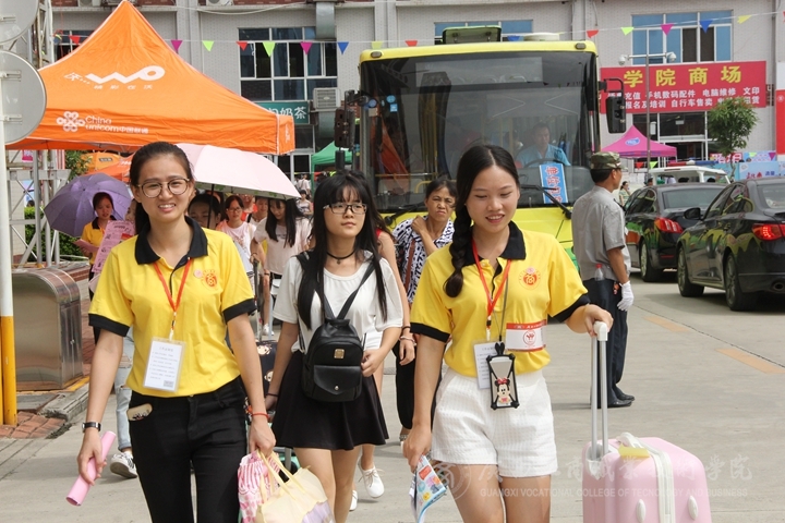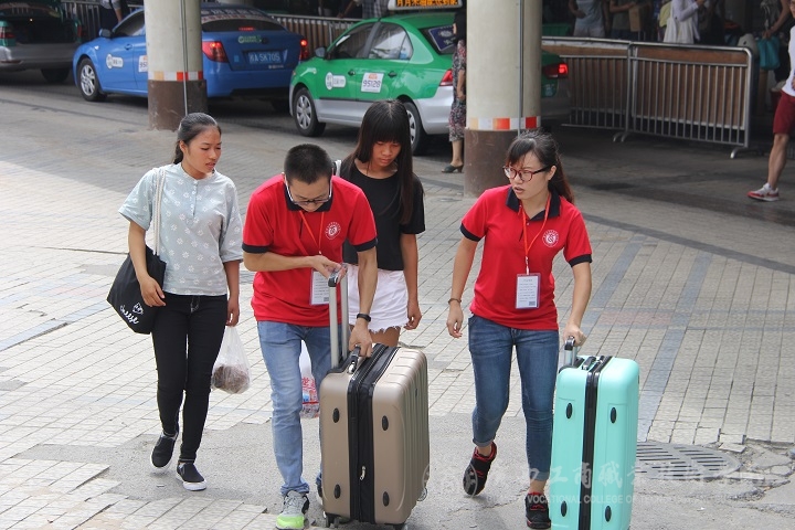 為了能夠讓新生到校報(bào)到,廣商院與往年一樣在火車站、瑯東客運(yùn)站、西鄉(xiāng)塘客運(yùn)站等七個車站分別設(shè)立新生接待點(diǎn)。上午六點(diǎn)半,志愿者們就從學(xué)院出發(fā)前往各車站接待點(diǎn),他們統(tǒng)一著裝,臉上洋溢著笑容,接待剛到車站有點(diǎn)無所適從的新生和家長,肩扛手提幫助新同學(xué)拿行李,再指引他們坐著統(tǒng)一的接站車回到學(xué)院,解答家長們的咨詢,帶領(lǐng)新生到各系去報(bào)道,安頓住宿,再給出一些校園的溫馨提示。每個新生聚集的地方都能看到他們?yōu)⑾碌暮顾?br />