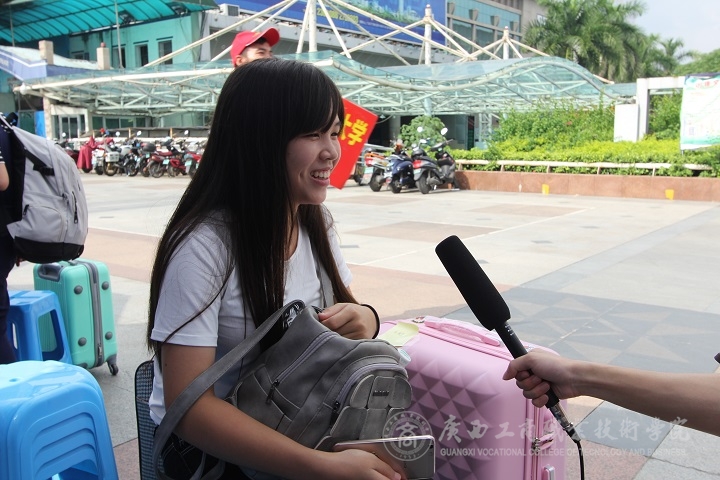 新聞中心學(xué)生記者蒙顯倫:欽州的動車過來也挺快的,那你是一個人過來嗎?一個人來學(xué)校報名,在路上沒人照顧,搬行李,會不會覺得孤單?