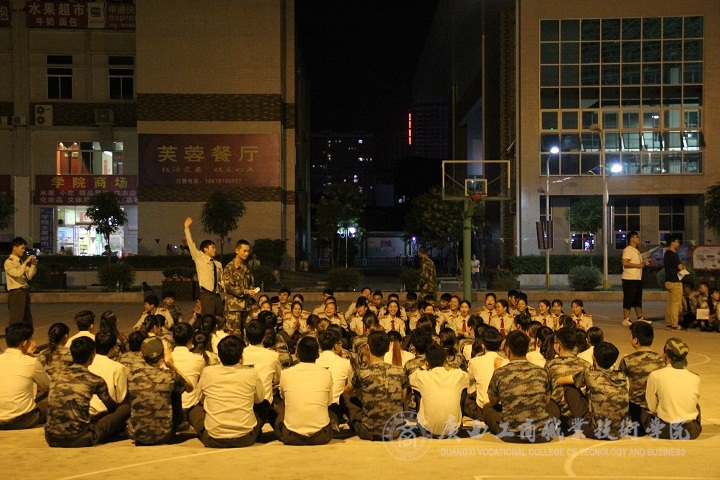 2016年9月20日19:30,新生軍訓(xùn)第一晚,夜晚的帷幕才剛拉開,嘹亮的軍歌已經(jīng)響起,“團(tuán)結(jié)就是力量,團(tuán)結(jié)就是力量,這力量是鐵,這力量是鋼……”他們的歌聲鏗鏘有力,富有激情,演唱的同學(xué)們都熱情飛揚(yáng),信心飽滿,在全場(chǎng)熱烈的掌聲中,新生又喊起了振奮人心的拉歌口號(hào),這個(gè)連喊道“東風(fēng)吹,戰(zhàn)鼓擂,要拉歌,誰怕誰”那個(gè)忙接道“冬瓜皮,西瓜皮,你們不要耍賴皮”“機(jī)關(guān)槍,兩條腿,打得你們張不開嘴”一聲接一聲,一聲大過一聲,大家都被帶動(dòng)了,扯開嗓子喊起來,一時(shí)間歡樂沸騰。訓(xùn)練場(chǎng)上到處飛揚(yáng)著歌聲、笑聲、鼓掌聲、吶喊聲,一排排的風(fēng)景線成了一道道獨(dú)特的風(fēng)景線。