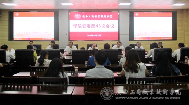 2016年10月25日下午15:00,我院在校本部2119會(huì)議室召開(kāi)了第45次黨委會(huì)。會(huì)上,學(xué)院黨委聽(tīng)取了黨委宣傳部、黨委學(xué)生工作部、社科部等部門對(duì)學(xué)院思政、德育工作的分析。學(xué)院黨委書記覃武云、院長(zhǎng)陳杰、黨委副書記蒙啟成、副院長(zhǎng)李仕欽、副院長(zhǎng)李維、副院長(zhǎng)陳寧春,全體黨委委員參加會(huì)議,學(xué)院副廳級(jí)調(diào)研員黃永蓬、監(jiān)察審計(jì)室負(fù)責(zé)人列席會(huì)議。