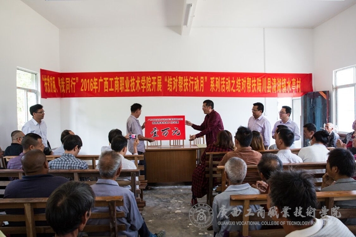 下午15時,在經(jīng)過7個多小時的長途跋涉后,我院幫扶對順利抵達水亭村與我院派駐水亭村掛職的第一書記譚爵璽老師和水亭村兩委干部匯合,隨后我院教職工不顧舟車勞頓立即組織開展“結(jié)對幫扶”活動,會上,我院派駐水亭村第一書記譚爵璽老師就2016年水亭村脫貧攻堅工作情況向?qū)W院領(lǐng)導(dǎo)和教職工做了簡要匯報,付光處長宣布了學(xué)院開展“結(jié)對幫扶行動月”系列活動之結(jié)對幫扶水亭村的活動正式啟動并對活動如何開展進行了布置安排,隨后和林雯主任一同代表學(xué)院向水亭村村委捐贈精準扶貧工作經(jīng)費一萬元整。清湖鎮(zhèn)副鎮(zhèn)長劉奇桂同志在會上代表清湖鎮(zhèn)黨委和政府感謝我院對水亭村精準扶貧工作的大力支持和無私幫助。