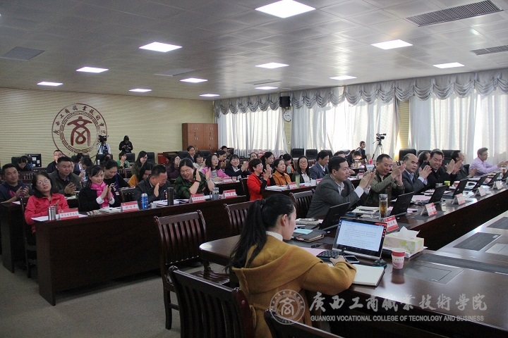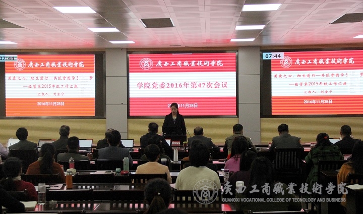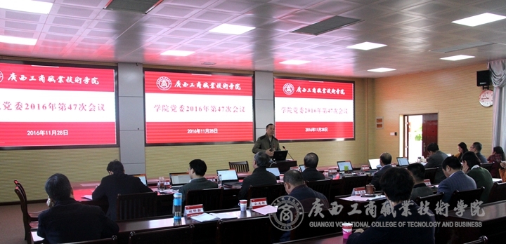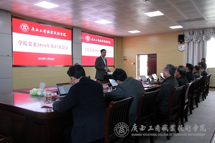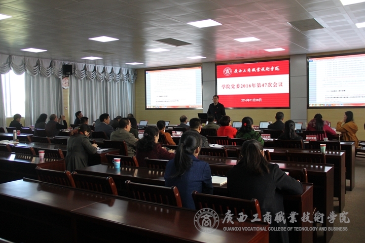 2016 年 11 月 28 日全天、29日下午,我院在校本部2119視頻會議室召開第47次黨委會,聽取我院教改和教師專題匯報。學(xué)院黨委書記覃武云、黨委副書記、院長陳杰、黨委副書記、紀(jì)委書記蒙啟成、黨委委員、副院長李仕欽、黨委委員、副院長李維、學(xué)院副廳級調(diào)研員黃永蓬、黨委委員、副院長陳寧春出席會議,蔣百平、覃超穎、林雯等三位黨委委員共同參會。