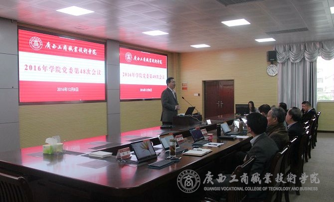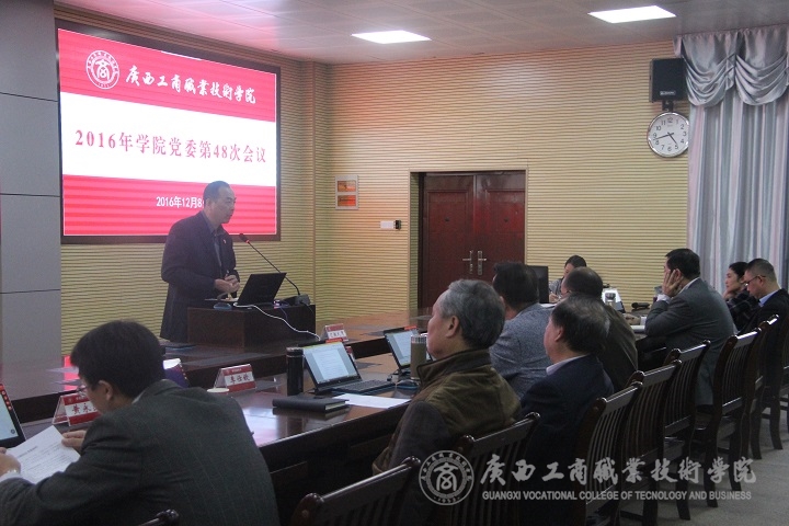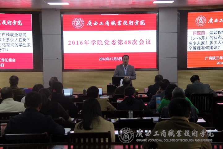 2016年12月8日下午3時(shí),我院召開(kāi)黨委會(huì),聽(tīng)取學(xué)院三年級(jí)管理工作匯報(bào)和畢業(yè)生就業(yè)創(chuàng)業(yè)工作匯報(bào)。學(xué)院黨委書(shū)記覃武云,黨委副書(shū)記、院長(zhǎng)陳杰,黨委副書(shū)記、紀(jì)委書(shū)記蒙啟成,黨委委員、副院長(zhǎng)李仕欽,黨委委員、副院長(zhǎng)李維,學(xué)院副廳級(jí)調(diào)研員黃永蓬,黨委委員、副院長(zhǎng)陳寧春和黨委委員蔣百平、覃超穎出席會(huì)議。會(huì)議由覃武云書(shū)記主持。