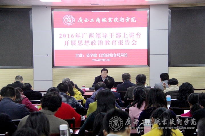 12月16日上午,2016年廣西領(lǐng)導(dǎo)干部上講臺(tái)開(kāi)展思想政治教育報(bào)告會(huì)在我院校本部舉行。自治區(qū)糧食局黨組書(shū)記、局長(zhǎng)吳宇雄同志作學(xué)習(xí)貫徹自治區(qū)十一次黨代會(huì)精神宣講報(bào)告。報(bào)告會(huì)由學(xué)院黨委副書(shū)記、院長(zhǎng)陳杰主持,副院長(zhǎng)李仕欽、副院長(zhǎng)陳寧春出席報(bào)告會(huì)。