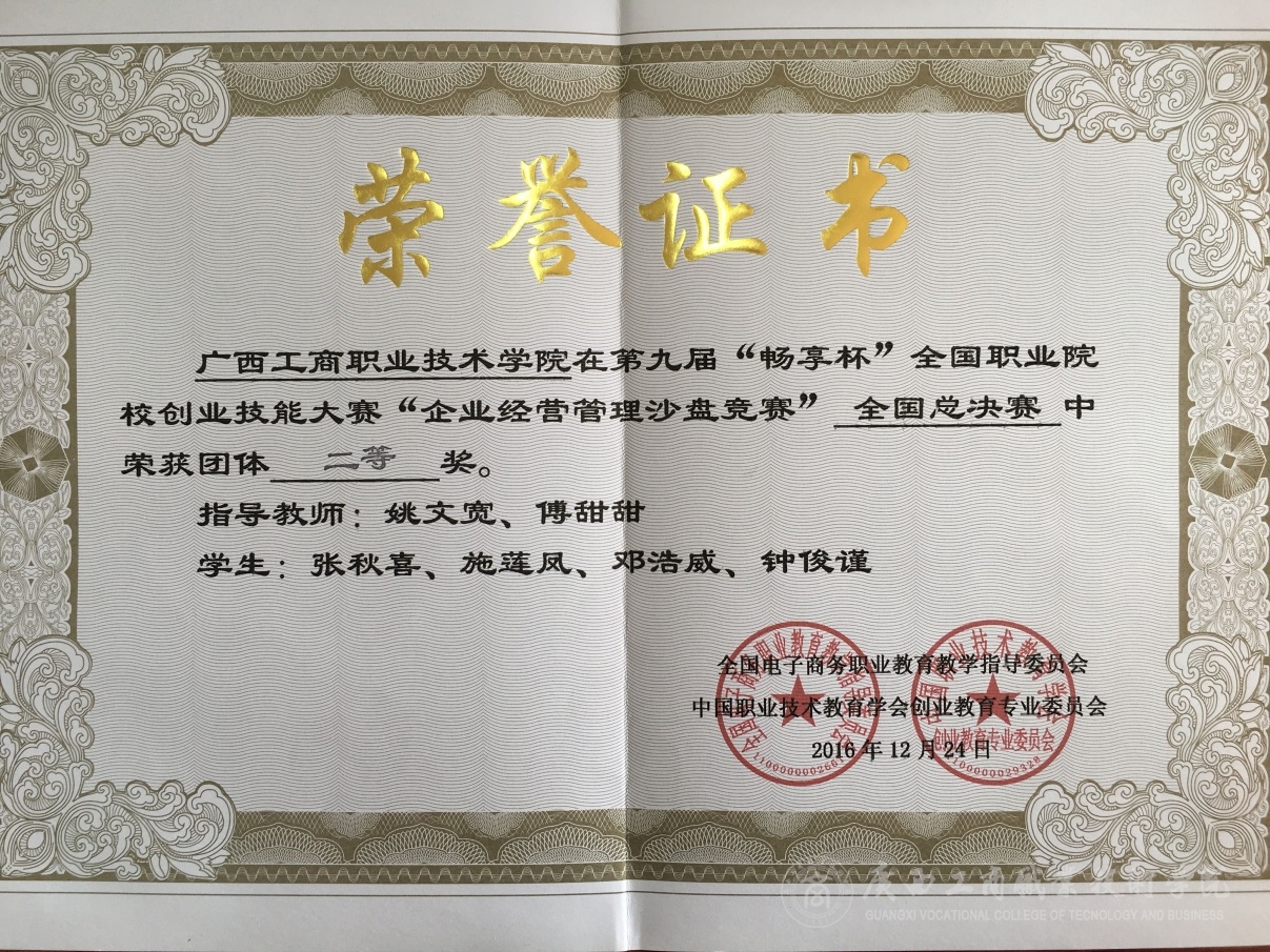 2016年12月23-25日,經(jīng)管系派出一支企業(yè)經(jīng)營管理沙盤隊(duì)伍代表學(xué)院赴山東泰安市參加第九屆“暢享杯”全國職業(yè)院校創(chuàng)業(yè)技能大賽“企業(yè)經(jīng)營管理沙盤競賽”全國總決賽。經(jīng)過參賽隊(duì)員的奮力拼搏,我院榮獲二等獎(jiǎng)的好成績。