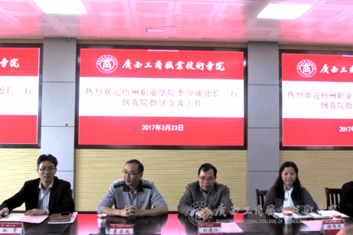 ??????? 2017年3月23日上午,梧州職業(yè)學(xué)院學(xué)工處李少成處長一行10人到我院就數(shù)字化校園建設(shè)、關(guān)鍵信息系統(tǒng)運(yùn)行和教學(xué)信息化、學(xué)生管理、財務(wù)流程管理、后勤管理等方面內(nèi)容進(jìn)行了對口經(jīng)驗交流。我院蒙啟成副書記出席交流會, 學(xué)生工作部孫德江部長、現(xiàn)教中心林雯主任主持會議,學(xué)院教務(wù)科研處、黨委辦公室、后勤管理處、財務(wù)處相關(guān)負(fù)責(zé)人參加會議。