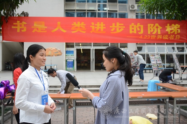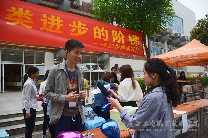 2017年4月24日中午,廣西工商職業(yè)技術(shù)學(xué)院在食堂門(mén)口舉辦了主題為“書(shū)是人類(lèi)進(jìn)步的階梯”的世界讀書(shū)日活動(dòng)。新聞中心學(xué)生記者就舉辦讀書(shū)日的意義對(duì)我院學(xué)生進(jìn)行了采訪(fǎng)。