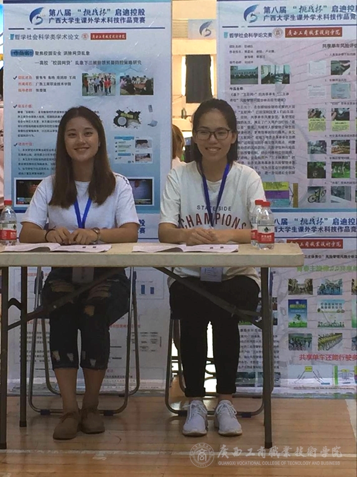 2017年5月27日,由共青團(tuán)廣西壯族自治區(qū)委員會(huì)、廣西壯族自治區(qū)教育廳等聯(lián)合主辦的第八屆“挑戰(zhàn)杯”啟迪控股廣西大學(xué)生課外學(xué)術(shù)科技作品競(jìng)賽開幕式在廣西科技大學(xué)體育場(chǎng)成功舉辦。本次競(jìng)賽共有全區(qū)36所高校的194項(xiàng)項(xiàng)目參與現(xiàn)場(chǎng)作品展示,有55項(xiàng)作品參與現(xiàn)場(chǎng)答辯,我院由學(xué)院團(tuán)委組織申報(bào)的作品共有7項(xiàng)(如下表),其中曾韋韋、龐鴻珍、王閱、朱艷等同學(xué)的《高?!靶@網(wǎng)貸”亂象下三維前饋預(yù)警防控策略研究》和黃星燦、盧光耀、謝聰、廖海德、蔡振江等同學(xué)的《基于“互聯(lián)網(wǎng)+”的共享單車“三主體責(zé)任”風(fēng)險(xiǎn)管理問題分析及防范研究》兩項(xiàng)作品入圍現(xiàn)場(chǎng)展示,其分別由張煌強(qiáng)、劉結(jié)玲兩位老師指導(dǎo)。