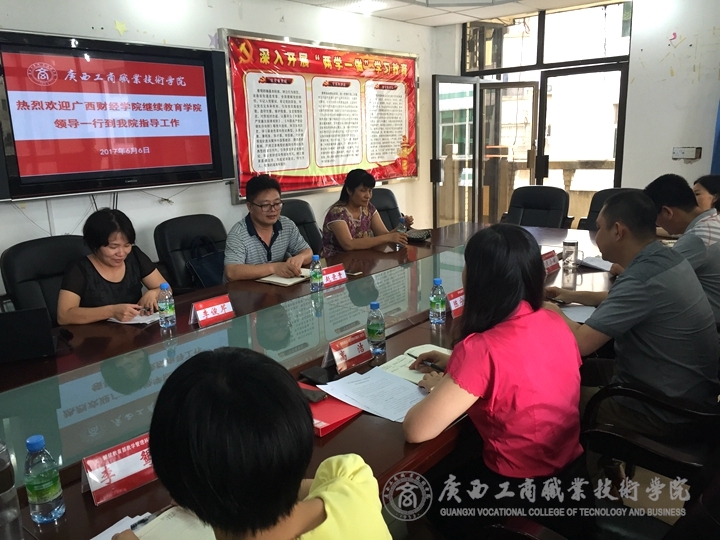 2017年6月6日下午4點,廣西財經(jīng)學院繼續(xù)教育學院副院長趙錄貴、自考培訓部副主任李俊芹以及李麗卿老師一行來到我院中堯路進行繼續(xù)教育工作交流。我院分管繼續(xù)教育部的陳寧春副院長率繼續(xù)教育部主任高潔、副主任段小斌、繼續(xù)教育部教學管理科李鴛、黃小英、賴婧婷老師參加了這次工作指導交流會議。