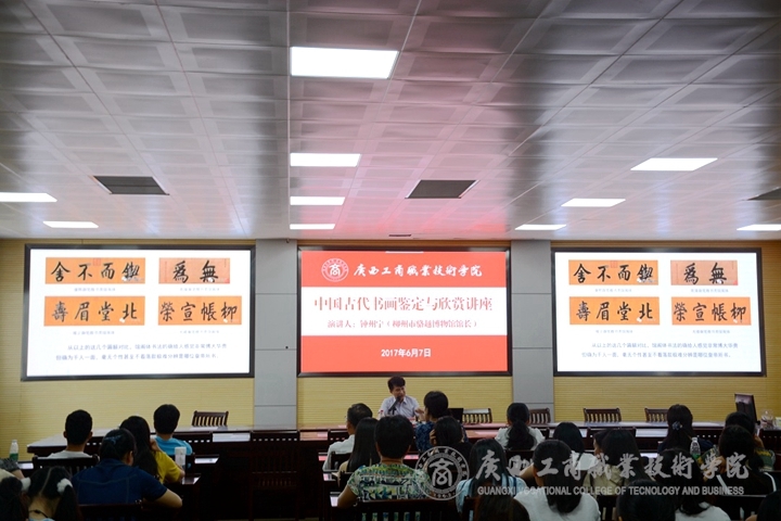 為豐富我院師生精神文化生活,2017年6月7日下午,我院在校本部舉辦中國古代書畫鑒定與欣賞講座。講座特邀請柳州市駱越博物館鐘州寧館長進(jìn)行講解,學(xué)院教師和同學(xué)們參加本次講座。