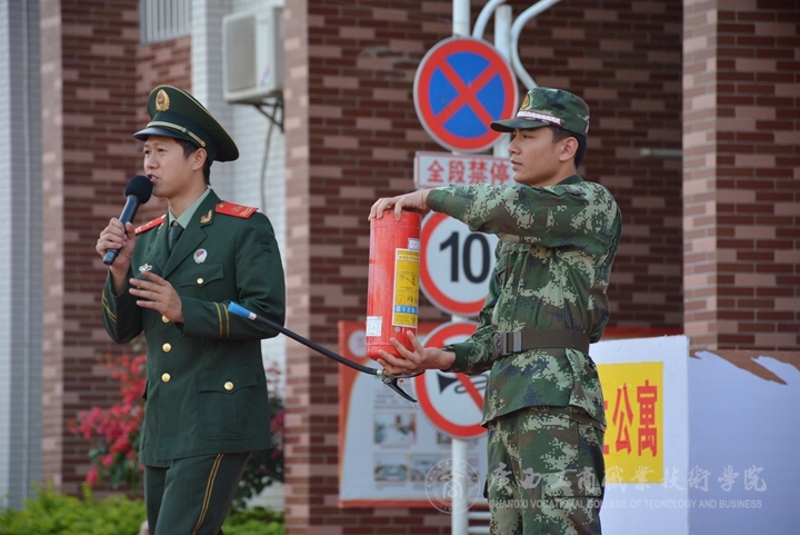 最后,由西鄉(xiāng)塘區(qū)消防城西中隊隊長助理李集卯就火災(zāi)情況的視頻和圖片講解、火災(zāi)應(yīng)急逃生、滅火器的使用、應(yīng)急逃生方法、報警方法等作消防滅火知識宣講。隨后李助理親身示范如何正確使用滅火器,有效進行滅火,在場的老師、保安和學(xué)生代表上前親身體驗滅火。