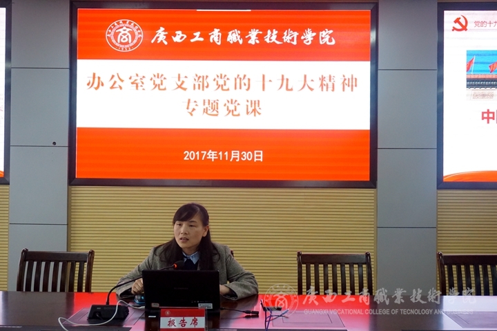 ? ? ? ? 根據(jù)學(xué)院十九大精神學(xué)習(xí)安排,辦公室黨支部于11月30日下午在2119視頻會(huì)議室組織舉辦了學(xué)習(xí)黨的十九大精神專題黨課。此次黨課由辦公室黨支部書記覃遠(yuǎn)霞主持,院長陳杰和覃遠(yuǎn)霞分別上了一節(jié)黨課,部門全體人員參加。