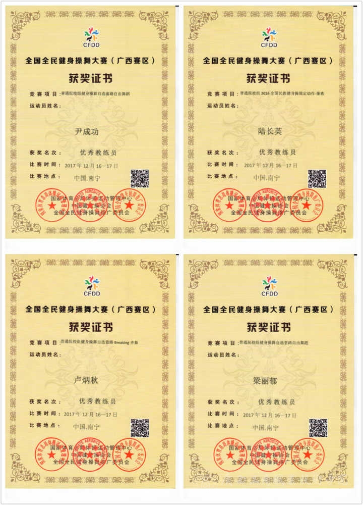 ??????? 此次比賽,學(xué)院高度重視,組成了由尹成功老師為總教練(全國健身操舞國家一級裁判員、教練員),盧炳秋、陸長英和梁麗郁老師為助理教練的團(tuán)隊(duì)。經(jīng)過精心選拔的46名運(yùn)動員共報(bào)名參加大學(xué)普通院校組的五個比賽項(xiàng)目。在教練員團(tuán)隊(duì)的悉心指導(dǎo)下,運(yùn)動隊(duì)員緊密協(xié)作,發(fā)揮出色,在大學(xué)普通院校組比賽中,榮獲街舞Breaking自選動作項(xiàng)目一等獎,2017年全國民族健身操規(guī)定傣族動作項(xiàng)目一等獎,民族健身操舞自選套路自由舞蹈項(xiàng)目一等獎,綜合齊舞風(fēng)格項(xiàng)目二等獎,運(yùn)動舞蹈項(xiàng)目二等獎。同時在此次比賽中,教練團(tuán)全體教師均榮獲 “優(yōu)秀教練員”。