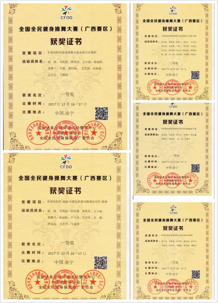 ??????? 2017年12月17日,2017年第六屆全國健身操舞大賽廣西分站賽在廣西幼兒師范高等??茖W(xué)校圓滿閉幕。我院體育運(yùn)動隊(duì)在比賽中團(tuán)結(jié)協(xié)作,奮勇拼搏,賽出了風(fēng)采,比出了水平。在全區(qū)88個參賽單位,180支參賽隊(duì)伍,2516名參賽運(yùn)動員中脫穎而出,獲得三個一等獎(冠軍),兩個二等獎,三個項(xiàng)目順利晉級2018年全國健身操舞大賽總決賽,繼去年獲得該項(xiàng)賽事優(yōu)異成績后,今年再次取得佳績。