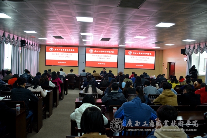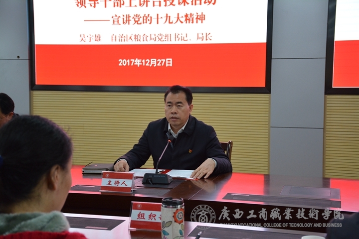 12月27日上午,2017年廣西領(lǐng)導(dǎo)干部上講臺(tái)開展思想政治教育報(bào)告會(huì)在我院校本部舉行。自治區(qū)糧食局黨組書記、局長(zhǎng)吳宇雄同志作學(xué)習(xí)黨的十九大精神宣講報(bào)告。報(bào)告會(huì)由學(xué)院黨委副書記、院長(zhǎng)陳杰主持,黨委副書記、紀(jì)委書記蒙啟成、副院長(zhǎng)李仕欽出席報(bào)告會(huì)。