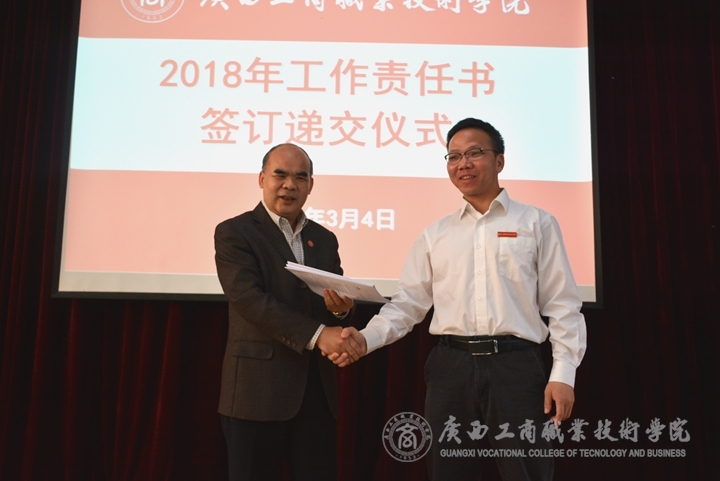 ? ? ? ? 在工作責(zé)任書簽訂遞交儀式上,覃武云與各部門負(fù)責(zé)人分別簽訂了2018年工作責(zé)任書,,即2018年黨建工作責(zé)任書、黨風(fēng)廉政建設(shè)責(zé)任書、基層黨組織落實意識形態(tài)工作主體責(zé)任責(zé)任書、安全穩(wěn)定工作責(zé)任書。