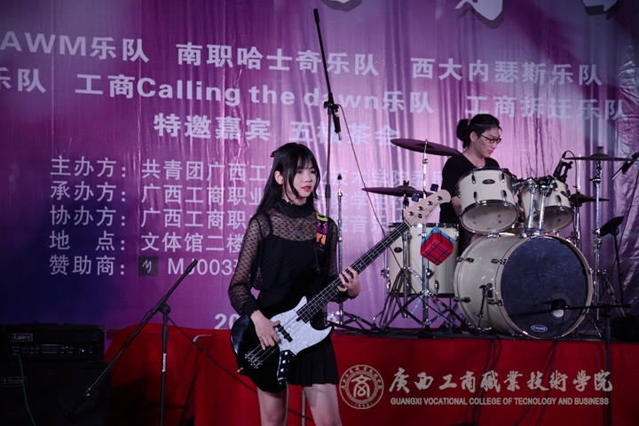 ? ? ? ? 隨后,南職“哈士奇樂隊(duì)”、西大“內(nèi)瑟斯樂隊(duì)”、工商“98K樂隊(duì)”、特邀嘉賓“五樓茶會”、民大“頑樂隊(duì)”、工商“拆遷樂隊(duì)”、工商“Calling the dawn樂隊(duì)”輪番上陣,風(fēng)格不一卻同樣精彩的音樂引爆廣商院。在音樂的帶動下,現(xiàn)場歡呼聲不斷,樂隊(duì)成員積極與場下觀眾互動,這是一場懷揣著熱愛音樂之心的人們的狂歡。