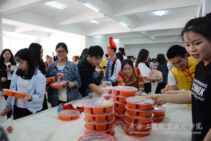 ??????? 2018年4月16日下午,廣西工商職業(yè)技術(shù)學(xué)院鵬飛校區(qū)文體館一樓,傳出一片歡聲笑語(yǔ),純植物染就的五色糯米飯飄香繞梁?!笆裁撮_(kāi)花節(jié)節(jié)高呢,嘿撩撩螺”一陣陣動(dòng)聽(tīng)的山歌飛出文體館,在校園里回蕩。