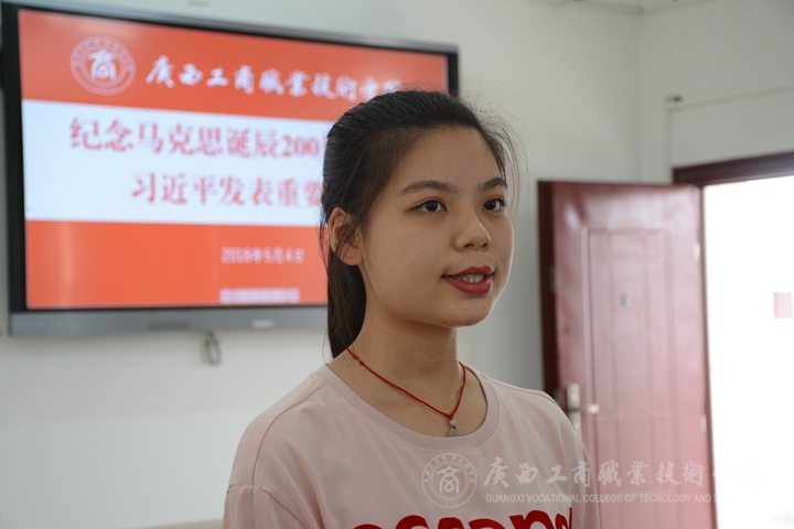 ??????? 經(jīng)管系廣策1601班楊欽梅同學(xué):今天總書記向我們講述了馬克思的一生,明確指出了馬克思主義對(duì)我們黨和國家的重要性,讓我們深刻明白馬克思主義的命運(yùn)早已同中國共產(chǎn)黨的命運(yùn)、中國人民的命運(yùn)、中華民族的命運(yùn)緊緊連在一起。因此我們要堅(jiān)定對(duì)馬克思主義的信仰,堅(jiān)持中國特色社會(huì)主義的道路自信、理論自信、制度自信、文化自信,努力成為中國特色社會(huì)主義合格建設(shè)者和接班人。