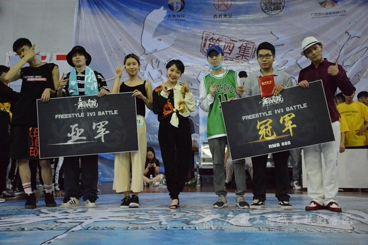 ? ? ? ? 最后經(jīng)過激烈的決戰(zhàn),“飛龍在天”戰(zhàn)隊冠軍贏得了freestyle3v3賽項的冠軍,“西城老男孩”拿下了Breaking賽項的冠軍,來自南寧職業(yè)技術學院的阿威贏得了seven to somke單人車輪戰(zhàn)的冠軍。賽后,來來老師和貓仔老師表演個人solo,在觀眾們熱烈的歡叫聲中,本次“舞戰(zhàn)商院”街舞大賽圓滿結束。